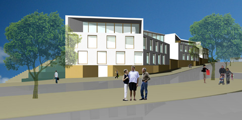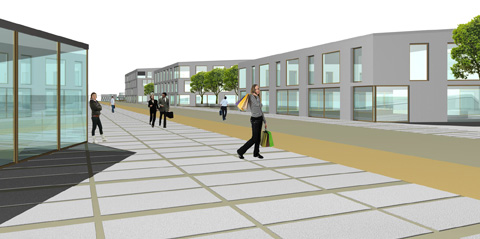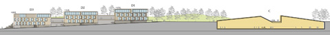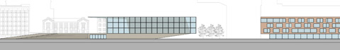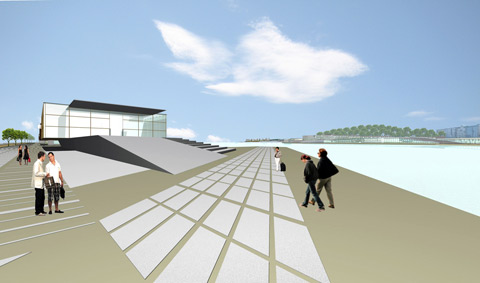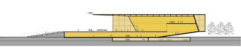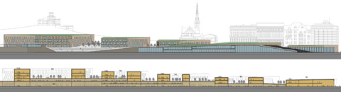Section and facade of the south quay. Mixed-use blocks and pedestrian street are built on the deck over cargo areas necessary for large passenger ships.